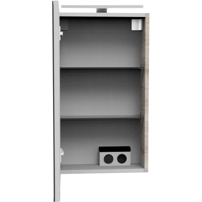 Immer mehr fungiert das Gästebad als Visitenkarte des persönlichen Einrichtungsstils. Der Fackelmann Spiegelschrank ist Teil der Small Bathroom Collection (SBC), mit der Fackelmann sein bewährtes Konzept für die Vielfalt und das elegante Ambiente im Gästebad neu überdacht und optimiert hat. Der hängend montierte Spiegelschrank begeistert mit zahlreichen ansprechenden Korpus- und Frontvarianten, die von Weiß über Anthrazit bis hin zu diversen Holzdekoren reichen. Die Beleuchtung des Spiegelschranks mit eingebauter LED-Aufsatzleuchte steuert eine Elektrobox mit Schalter und Steckdose. Die Tür links lässt sich ohne Griff öffnen. Im Inneren ist der Spiegelschrank mit 2 Glasablageböden ausgestattet, die 3 Fächer ergeben, welche viel Stauraum für alle notwendigen Badutensilien gewähren.