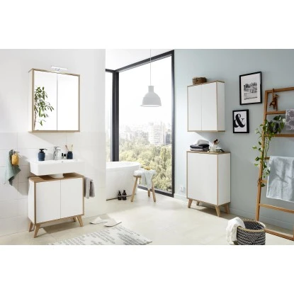 Die Artikel der Fackelmann Badmöbel-Serie Finn tauchen Ihr Bad in ein nordisches Ambiente. Diese Badmöbel verbinden ein attraktives Design mit hoher Qualität und noch besserer Funktionalität. Schaffen Sie ein wohnliches Ambiente zum Wohlfühlen in Ihrem Bad oder Ihrem Gästebad. Bei den Dekoren können Sie zwischen drei Farbvarianten, ob Weiß, Natur oder Anthrazit, entscheiden und Ihr Bad ganz nach Ihren Wünschen gestalten. Die exklusiven Push-to-Open-Türen erlauben das grifflose Öffnen der Schränke und sorgen für ein harmonisches Front- und Gesamtbild. Ein weiteres Highlight ist, dass sich die Badmöbel auf Wunsch von hängenden in stehende Möbel umwandeln lassen. Die massiven Eichenholzfüße (nicht im Lieferumfang enthalten) sind blitzschnell montiert. Dank des umfassenden Angebots können Sie Ihre Badeinrichtung je nach Raumgröße beliebig erweitern.