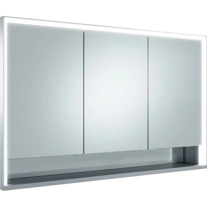 Der Keuco Royal Lumos Spiegelschrank ist für die Wandeinbau-Montage geeignet. Er verfügt über eine stufenlos einstellbare Lichtfarbe von 2700 Kelvin (warmweiß) bis 6500 Kelvin (Tageslicht). Der Spiegel des Keuco Royal Lumos Spiegelschranks ist mit 3 Drehtüren aus Kristall-Doppelspiegel ausgestattet. Der Korpus ist aus Aluminium in silber-gebeizt-eloxiert. Darüber hinaus punktet der Schrank mit verspiegelten Rück- und Seitenwänden sowie praktischen Details. Die Bedienung erfolgt über Tastenfelder mit kapazitiver Touch-Sensorik und integrierten Nebenstellenfunktionen für z. B. Raumschalter.
