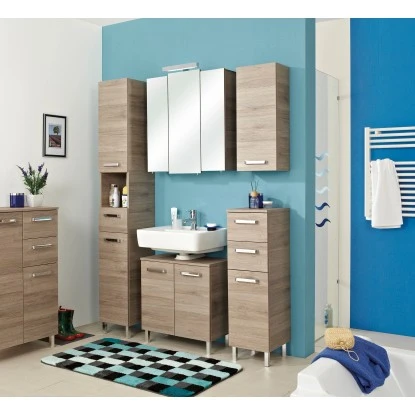 Das prägnant moderne Holzdekor Sanremo Eiche Terra bestimmt auf den ersten Blick das Badmöbelprogramm Quickset 313. Die schnörkellos gestalteten Möbel sind perfekt aufeinander abgestimmt und bieten Qualität, Komfort und viel Stauraum. Das gilt besonders für den dreitürigen Spiegelschrank der Serie, der mit Einlegeböden, integrierter LED-Beleuchtung und einer Steckdose ausgestattet ist. Von Außen ist Ihr neues Möbelstück einer hochwertigen Folie in Holzoptik und -haptik überzogen. Innen ist Ihr Badmöbelstück mit weißem Melamin beschichtet: Ideal für eine schnelle Reinigung und weniger feuchtigkeitsanfällig. Unsere Möbel werden von uns nach modernsten Verfahren und Umweltstandards hergestellt. Entdecken sie ein preisgünstiges Badmöbelprogramm mit allen Eigenschaften, die sie sich für ihr neues Bad wünschen.