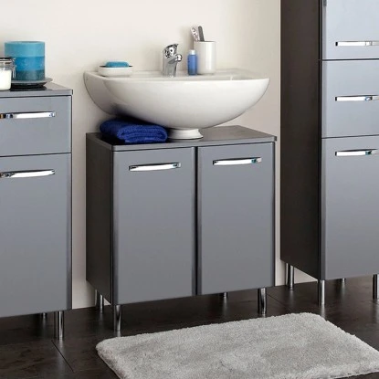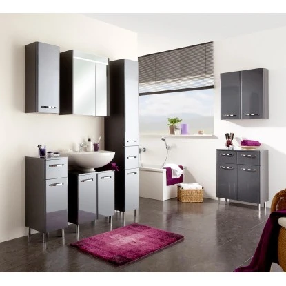 Mit dem Badmöbel-Set Velo erhalten Sie eine perfekt aufeinander abgestimmte Badmöbelserie für einen eleganten Look in Ihrem Badezimmer. Die Fronten und Korpen der geradlinigen Kombinationen mit den weichen Kanten sind im eleganten, glänzenden Anthrazit gehalten. Neben der hohen Qualität durch hochwertige Verarbeitung bietet das Set eine tolle Kombination aus Waschtischunterschrank, Spiegelschrank und Beimöbeln. Die Beimöbel sind entweder mit komfortablen Schubkästen oder mit gedämpften Türen ausgestattet und bieten viel praktischen Stauraum, der durch zusätzliche Einlegeböden zudem bestens organisiert werden kann. Der Waschbeckenunterschrank passt zu jedem Waschbecken. Der Spiegelschrank sorgt sowohl für perfekte Organisation als auch für perfektes Licht durch die LED-Aufsatzleuchte. Das Set Velo kann wandhängend oder stehend (Fuß-Set separat erhältlich) montiert werden, so wie es Ihnen am besten gefällt. Überzeugen auch Sie sich von dieser Kombination aus Design und Qualität in Ihrem eigenen Zuhause.