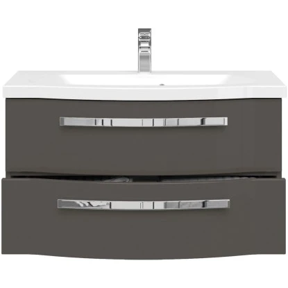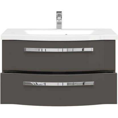 Das 2-teilige Pelipal Badmöbel-Set Fokus 4005 zeichnet sich durch edles Design und hohe Funktionalität aus. Das Set, bestehend aus einem elegant geschwungenen Waschbeckenunterschrank und einem hochwertigen Mineralmarmor-Waschtisch lässt sich mit seinen Fronten in trendigem, steingrauem Hochglanz Lack in beinahe jede Stilrichtung integrieren. Die Bügelgriffe in Chrom Glanz unterstreichen die lackierte Front und setzen klare Akzente in Ihrem Badezimmer.