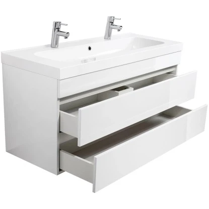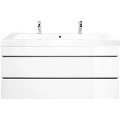 Wenn Sie nach einem Badmöbel Ausschau halten, welches Qualität, Klasse und schickes Design vereint, ist der Doppel-Waschplatz Metis 120 eine nähere Betrachtung wert: in glänzendem, strahlendem Weiß macht der Waschplatz seine Aufwartung. Gleich 2 Softclose Schubladen, die sanft und leise schließen und sich grifflos leicht öffnen lassen, sorgen für genügend Stauraum und Platz. Direkt auf dem Waschtisch sitzt das harmonisch geformte Mineralguss Waschbecken auf. Das Waschbecken überzeugt durch Platz für zwei Waschtischarmaturen, sodass es keine Wartezeiten mehr im Bad gibt. Mit der ebenfalls weißen Farbe steht das Badmöbel ganz weit oben, wenn es um Möbel für Ihr großes Badezimmer oder Gäste-WC geht.