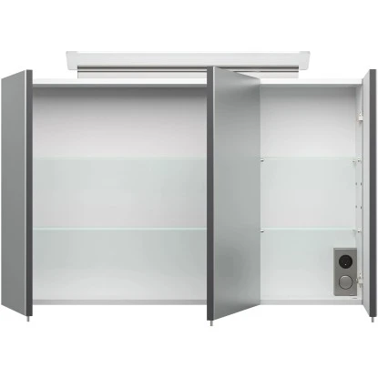 Der Posseik Spiegelschrank mit LED-Acrylglaslampe lässt sich dank seiner feuchtigkeitsresistenten Oberflächen besonders leicht und schnell pflegen. Durch 3 Spiegelfronten, die mit kaum sichtbaren Stiftgriffen geöffnet werden, wird der Raum optisch erweitert und der Schrank kann seine zurückhaltende Eleganz entfalten.In den durch 4 Glas-Einlegeböden eingeteilten 6 Fächern lassen sich problemlos Zahnputzzeug, Make-up oder Handcreme unterbringen. Dort befindet sich eine praktische Steckdose, um Fön und Rasierer anzuschließen. Auch das Softclose-System der Türen erweist sich im alltäglichen Gebrauch als angenehm nützlich.