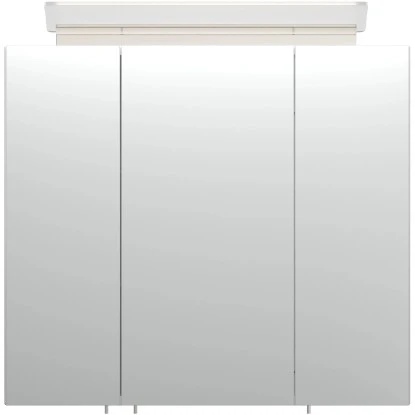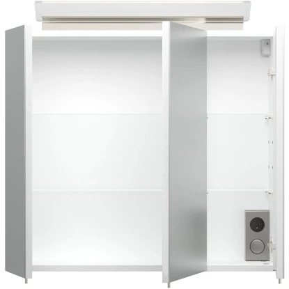 Sämtliche Ansprüche an einen Spiegelschrank finden Sie hier erfüllt: Neben der atmosphärischen Beleuchtung ist zusätzlich an der Seite der An- und Ausschalter sowie eine praktische Stromsteckdose angebracht. Hier können Sie beispielsweise Ihren Fön oder Rasierer ganz ohne Kabelsalat einstecken. Die Türe schließt sanft mit dem Soft-Close-Schließsystem. Die hochglänzende weiße Beschichtung ist wasserabweisend.