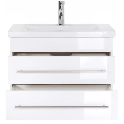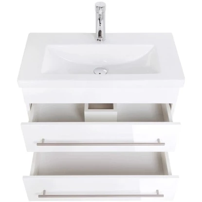 Damit Sie alle notwendigen Dinge, die täglich im Bad benötigt werden, sicher verstauen können, hat der Waschtisch gleich zwei Softclose Schubladen. Lange Handgriffe aus Edelstahl und eine leise Schließvorrichtung, schonen die Schubladen und machen das Möbelstück langlebiger. Dafür sorgen ebenso wasserabweisende Oberflächen am Keramik Waschbecken und Waschtisch, die stoßresistent sind und somit unschöne Kratzer vermeiden. Zudem setzen sich auch Wasser, Staub oder anderer Schmutz nicht so schnell am Badmöbel fest und können, falls sie sich dennoch ansetzen, schnell von Ihnen mittels eines weichen Tuchs weggewischt werden.