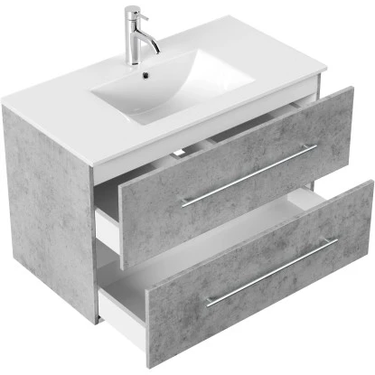 Das Waschbecken ist in einen praktischen Unterschrank eingefügt. Dieser führt die modernen, eckigen Formen des Beckens fort. Das Badmöbel verfügt über vier Schubladen mit Soft-Close-Systemen für schonenderes Schließen. Die Schienen verfügen über einen wEichen Vollauszug, der Ihnen dauerhafte Übersicht über die gesamten Schubladen ermöglicht. Der Waschbeckenunterschrank ist aus MDF gefertigt und in den Schubladen mit Weißem Melamin beschichtet. So ist er besonders feuchtigkeitsresistent und zudem leicht zu reinigen. Die Handgriffe sind aus matt gebürstetem Edelstahl. Mit seinen Maßen von 54 cm x 90 cm x 46 cm (H x B x T) erhalten Sie mit dem Homeline Waschbeckenunterschrank praktischen Stauraum für Ihr Badezimmer.Bitte beachten Sie, dass das Waschbecken auf den Unterschrank aufgesetzt wird und nicht zur Montage an der Wand vorgesehen ist. Ein Montageplan liegt bei.