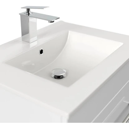 Nicht zum Lieferumfang gehören Armaturen, Zuleitungen zum Wasserhahn, der Waschbeckenverschluss Popup und der Syphon.