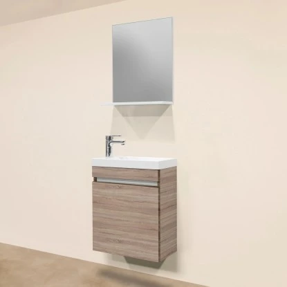 Der Unterschrank verfügt über 1 Tür, hinter der sich viel Platz für Ihre Bad- und Kosmetikartikel oder auch Putzmittel verbirgt. Zudem verfügt die Tür über eine eingebaute Soft-Close Funktion für eine sanftes und geräuschloses Schließen. Der Anschlag der Tür ist reversibel und passt sich somit den jeweiligen Gegebenheiten an. Der Schrank ist bereits vormontiert und ermöglicht Ihnen eine einfache und rasche Montage ohne viel Aufwand. Das edle Mineralgusswaschbecken überzeugt besonders durch die pflegeleichte Oberfläche. Der Spiegel lässt Ihr Bad heller und freundlicher wirken und verfügt über eine praktische Ablage. Hier finden täglich gebrauchte Kosmetikartikel Ihren Platz.