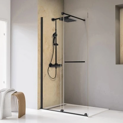 Die Schulte Walk In Schiebetür Toura mit Rollen an der unteren Laufschiene des Herstellers Schulte punktet auf Anhieb mit der brillanten Transparenz ihrer Echtglaselemente (ESG, 8 mm) sowie der modernen, dynamischen Optik ihrer Anbauteile aus Aluminium in Schwarz. Diese freistehende Duschabtrennung fungiert als Eyecatcher in jedem Bad und bietet zugleich ein hohes Maß an Sicherheit. Zudem stellt die Duschabtrennung, deren Türelemente über formschöne Laufrollen an der unteren Kante bewegt wird, einen komfortablen Einstiegsbereich bereit und der Handtuchhalter an der Außenseite fungiert auch als Accessoire der Duschtür.