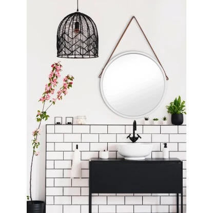 Der runde Spiegel in weiß mit einem PU-Band in Lederoptik verleiht Ihrem Bad ein modernes Design. Der Spiegel ist beschlagfrei und hat eine Abmessung von 50 cm x 50 cm x 3,5 cm..