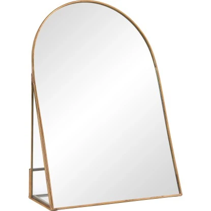 Der moderne Standspiegel aus der Trendkollektion Blush Bordeaux stellt ein dekoratives Accessoire für verschiedene Wohnbereiche dar. Er kann auf einem Schminktisch aufgestellt werden oder dient als Zierelement auf Kommode oder Beistellmöbel. Sein oben abgerundeter Rahmen ist in Gold gehalten. Integriert ist ein Standfuß mit Schmuckablage, der für eine optimale Neigung des Kosmetikspiegels sorgt. Seine Einfassung besteht aus Metall. Mit den Abmessungen von 22 cm in der Höhe und 15 cm in der Breite bei 5,5 cm Tiefe findet der Rahmenspiegel überall einen Platz zum Aufstellen.