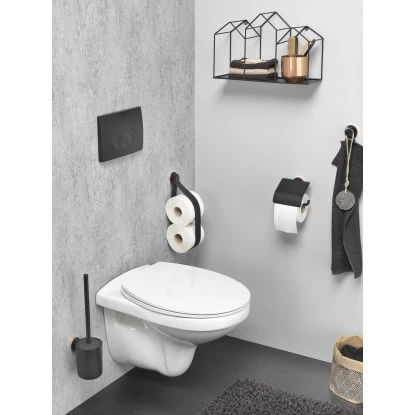 Der formschöne Toilettenrollenhalter ist schwenkbar und fügt sich stilvoll in jedes Bad ein. Die Serie Urban in trendigem Schwarz bietet modernes, industrielles Design. Individuellen Touch verleihen Sie den Accessoires mit den beigefügten Dekor-Ringen in Dunkelgrau oder Kupfer. Die Artikel lassen sich einfach mittels der mitgelieferten Edelstahl-Schrauben und Dübel an der Wand befestigen. Alternativ können Sie die Accessoires auch ohne zu Bohren mit dem separat erhältlichen Tigerfix-Befestigungsset Nr. 1 kleben.
