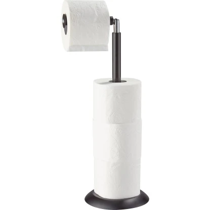 Der WC-Rollenhalter in Schwarz ist in schlichter Optik gehalten. Er bietet ausreichend Platz für eine Toilettenpapierrolle zum direktem Abrollen und drei zusätzliche Ersatzrollen. Durch das Knickgelenk lassen sich die Ersatzrollen problemlos auffüllen. Direkt neben der Toilette platziert, ist der Rollenhalter stets griffbereit und eignet sich so für den täglichen Gebrauch.